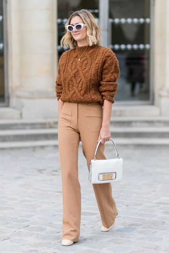 A cozy khaki cable knit sweater paired perfectly with matching tailored trousers creates a stylish monochrome look. Complete the ensemble with white framed sunglasses and a structured designer handbag for a casual yet sophisticated outing. Wear with confidence by tucking in the sweater to accentuate your waistline.